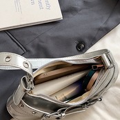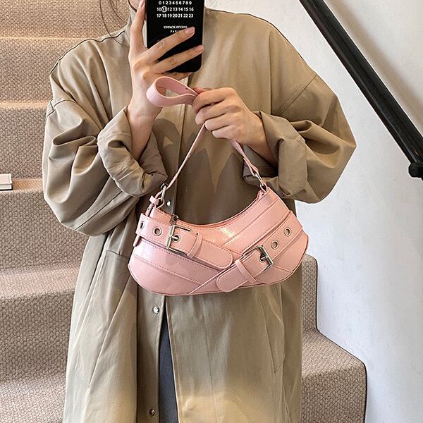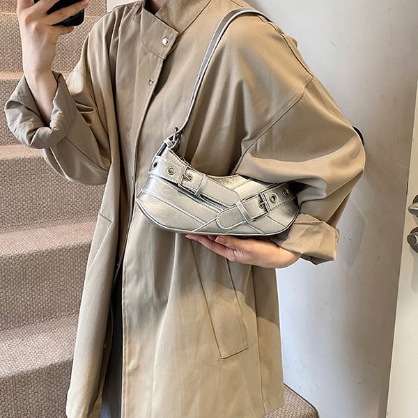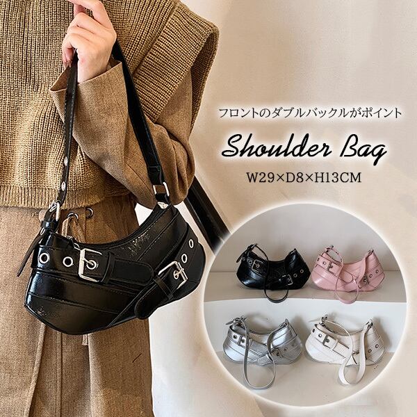 フロントのバックルがポイント スクエアベルトショルダーバッグ