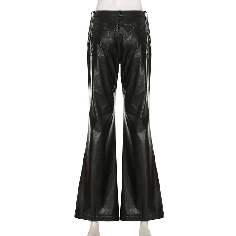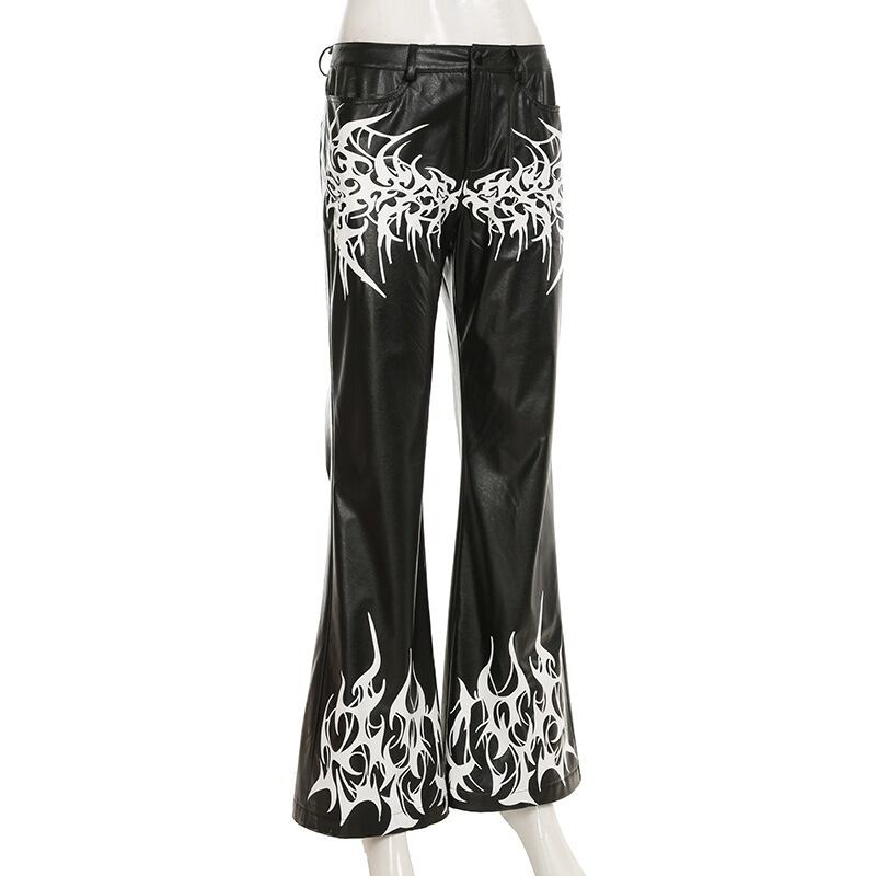 パンツ ボトムス ズボン PU フェイクレザー フレアパンツ ローライズ プリント レディース