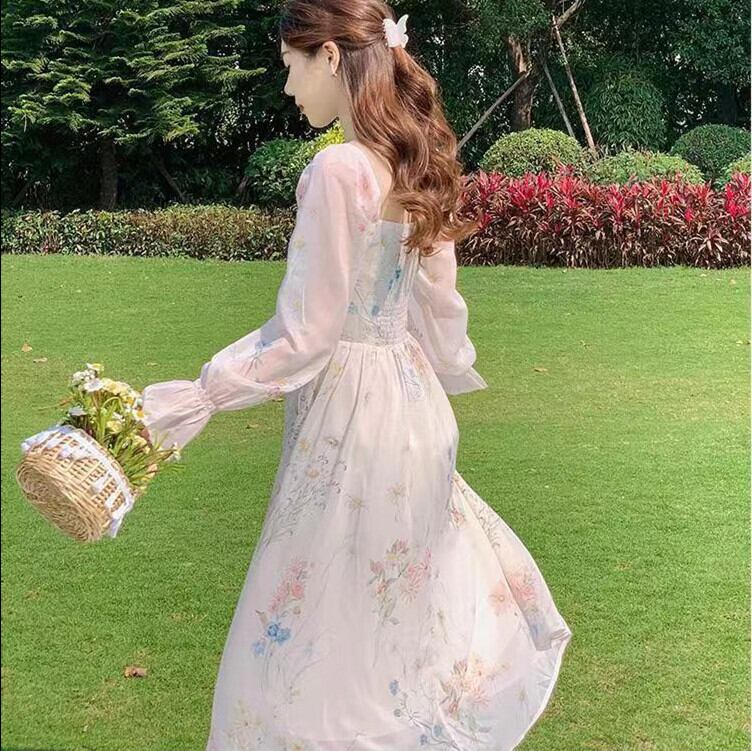 # 新作★レディース★着痩せ シフォン ワンピース ロングワンピース 長袖 キャンディースリーブ 花柄 フレアワンピ!