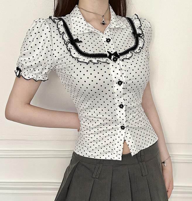 トップス 女 レディース 半袖ドット シャツ ブラウス コート アウター