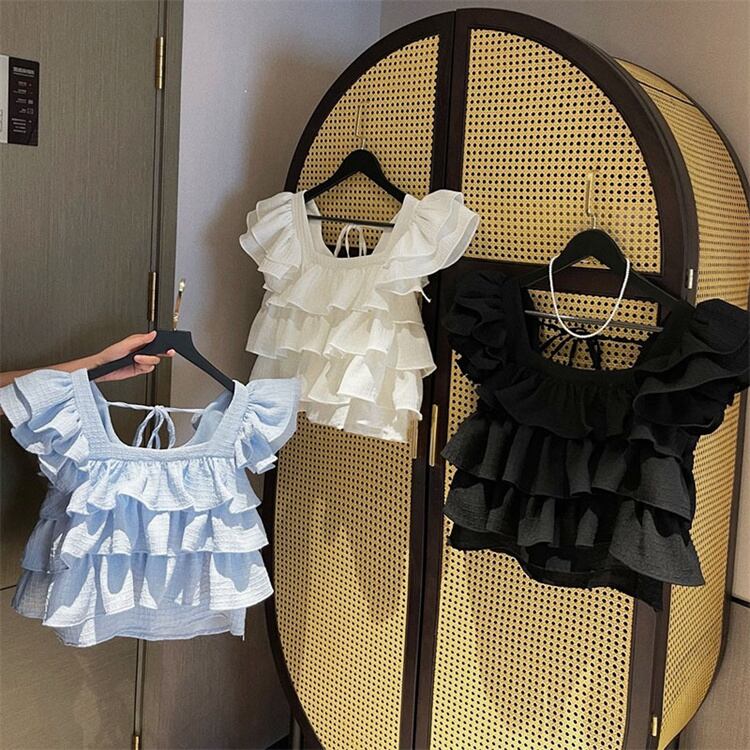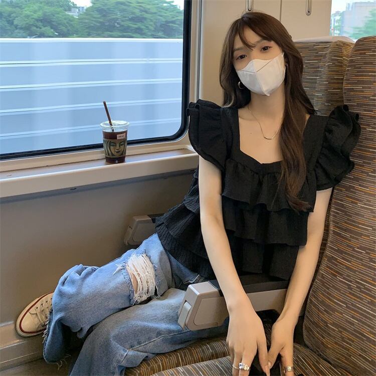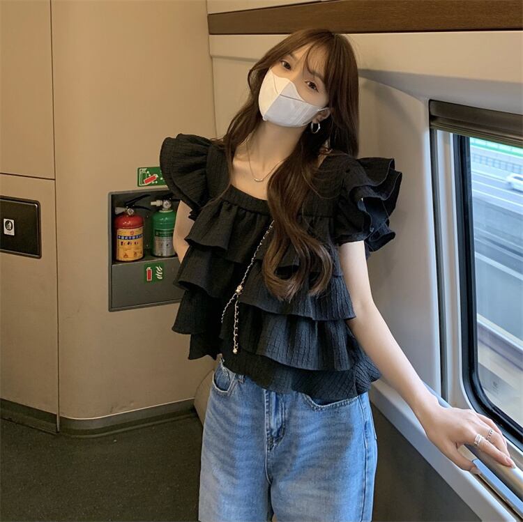 フリル袖 気質 スクエアネック 上着 半袖 ケーキのブラウス シャツ